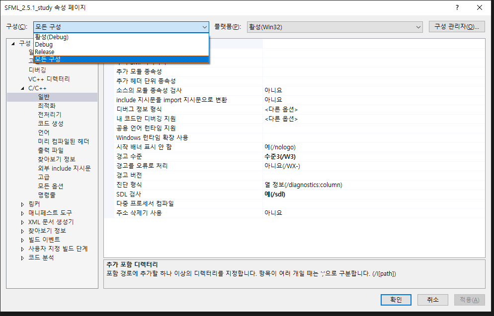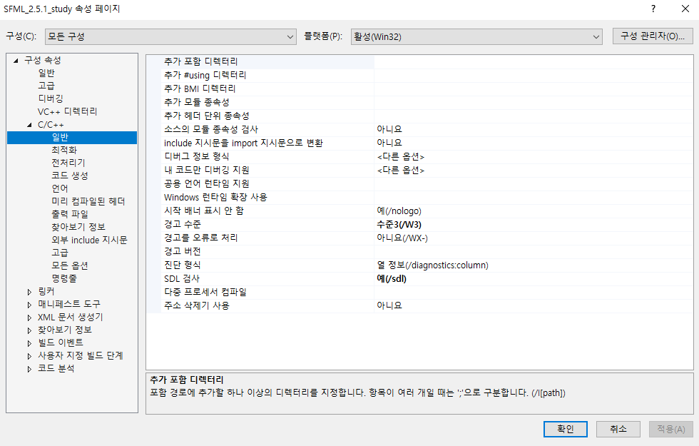구성 속성 - C/C++ - 일반 - 추가 포함 디렉터리에 SFML의 include위치를 입력한다.