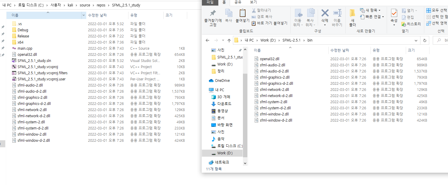 SFML 폴더 안 bin풀더안에 있는 파일들을 프로젝트가 위치한 폴더로 이동시켜 줍니다.
