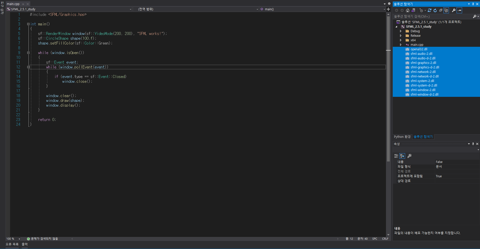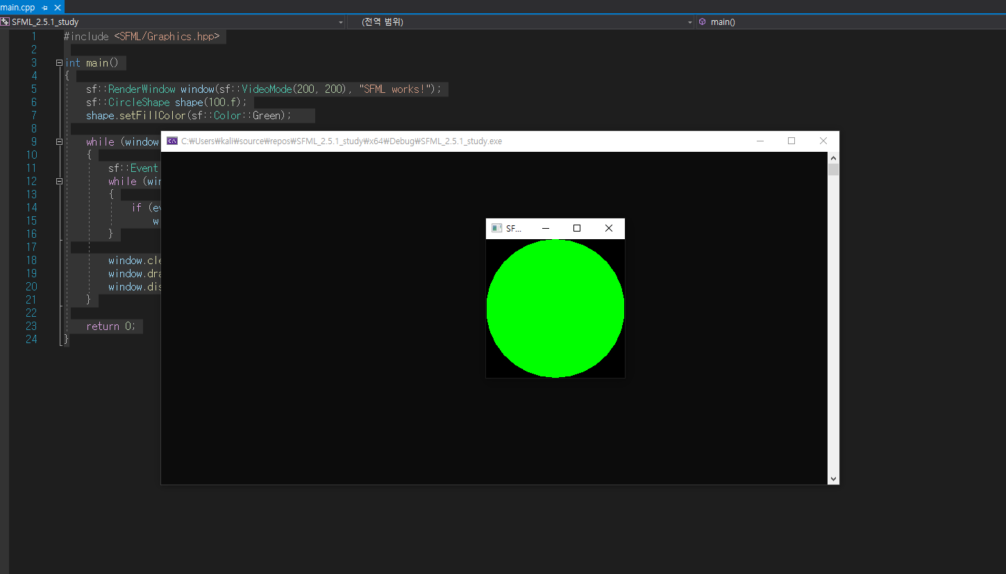 그리고 아래 예제를 실행하여 SFML이 정상적으로 작동하는 확인 해봅시다.