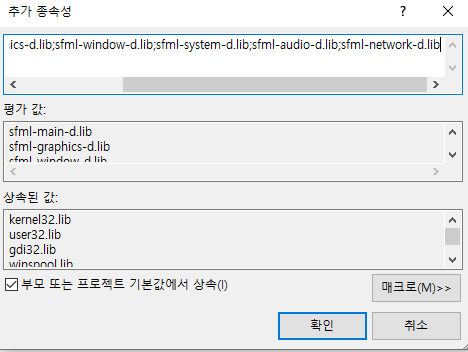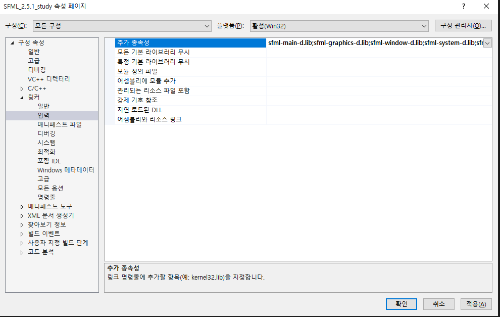 "sfml-xxx-d.lib"은 Debug용 "sfml-xxx.lib"는 Release용이다. 여기서는 d가 붙어있으니 디버깅용으로 사용된다.