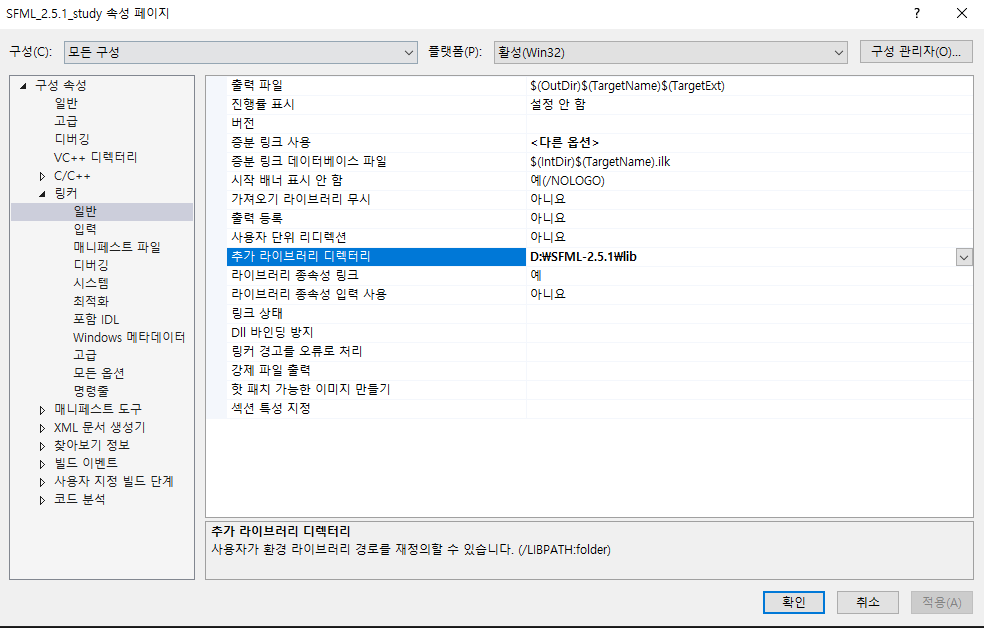 구성 속성 - 링커 - 일반 - 추가 라이브러리 디렉터리에 SFML의 lib 폴더를 저장한다.