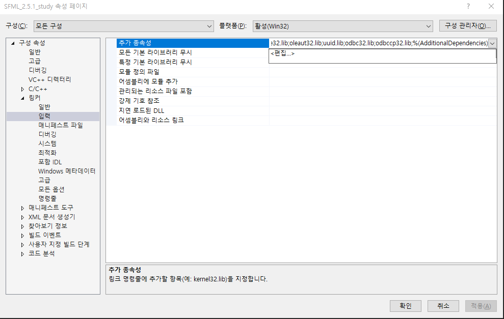 구성 속성 - 링커 - 입력 - 추가 종속성을 클릭하면 아래와 같이 편집이 나타난다 클릭해 주자