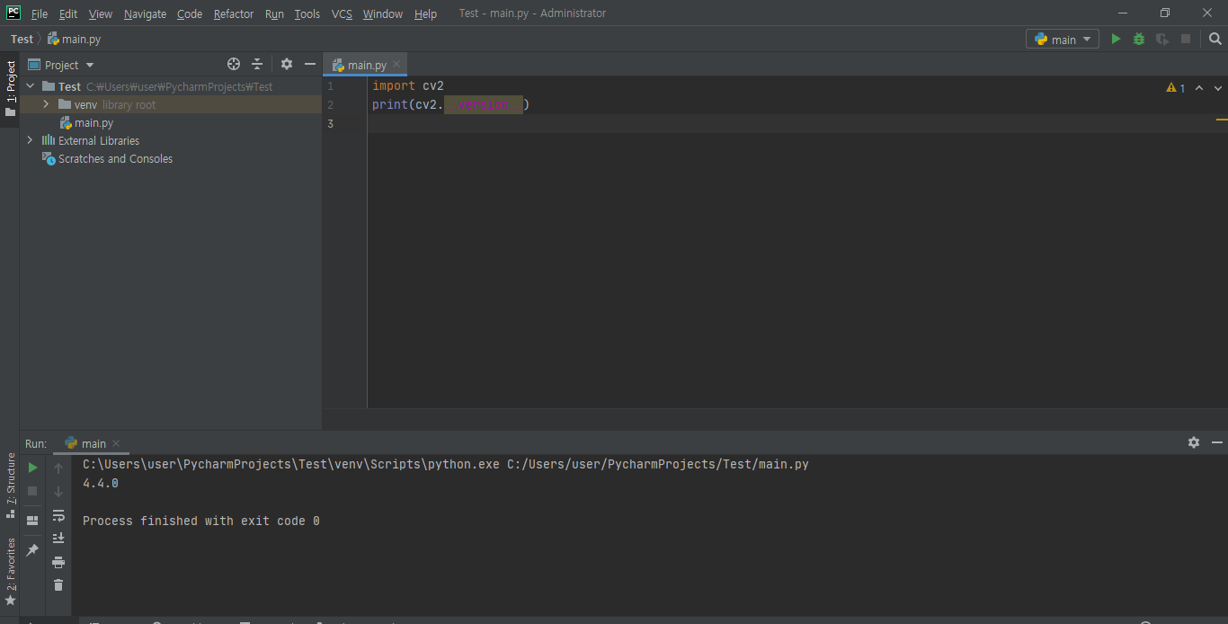 설치가 완료된 후 다음과 같은 코드를 입력하고 실행시키면 OpenCV의 버전이 출력되면서 설치가 잘된 것을 확인할 수 있습니다.