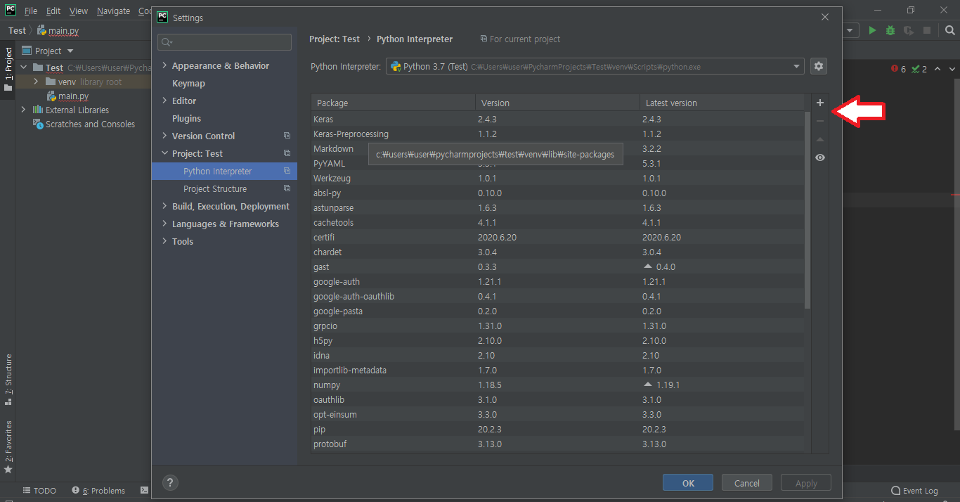 그림과 같이 화살표가 가리키는 + 버튼을 누르면 파이썬의 패키지를 추가할 수 있습니다.
