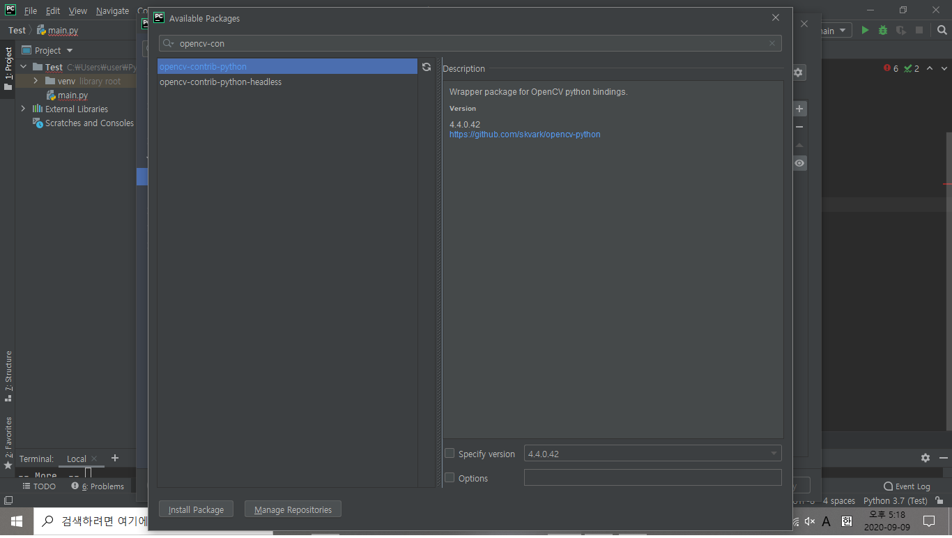 위와 동일한 방법으로 opencv-contrib-python 검색 - Install Package 클릭을 마치면 OpenCV가 설치됩니다.