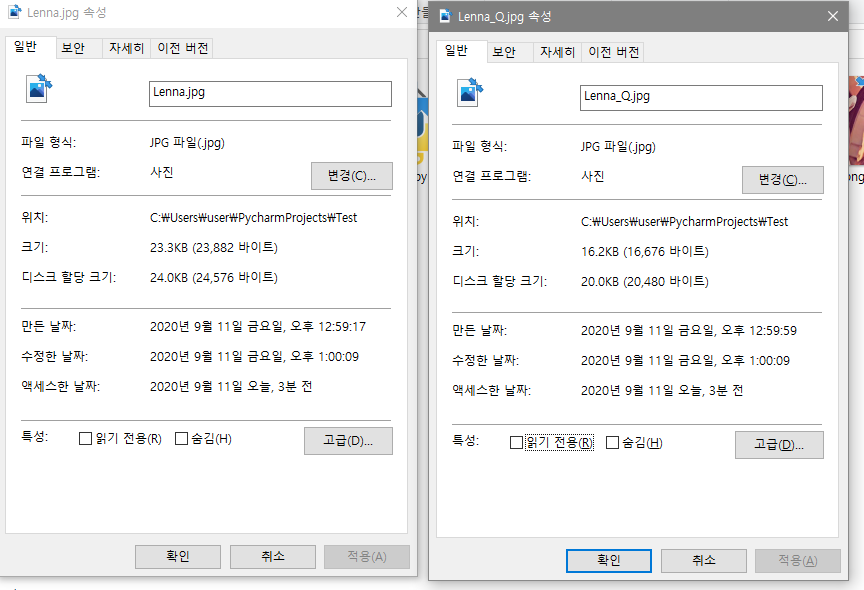 저희가 Lenna_Q.jpg 파일은 옵션으로 품질을 90% 만 반영했기 때문에 원본에 비해 파일 크기가 작아진 것을